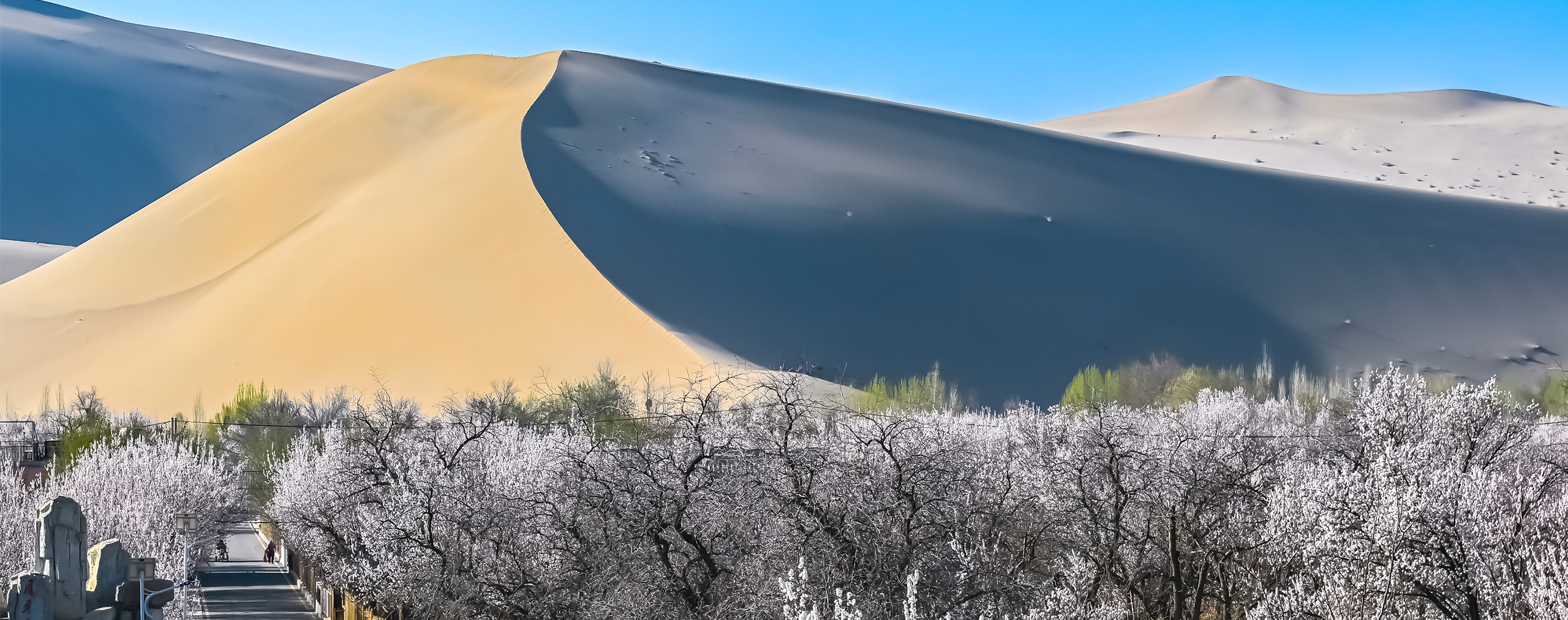 鸣沙衔春 杏花染漠 金灿沙山为幕,粉白花枝作景,大漠与春色撞个满怀,为丝路古城晕开满溢生机的春日盛景。