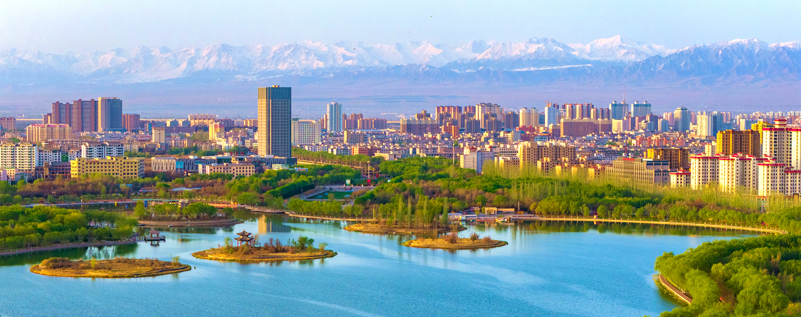 生态公园春意盎然 甘肃省张掖市甘州区润泉湖公园碧水蓝天、翠柳成荫、春意盎然,与城市楼群和祁连雪峰交相辉映。